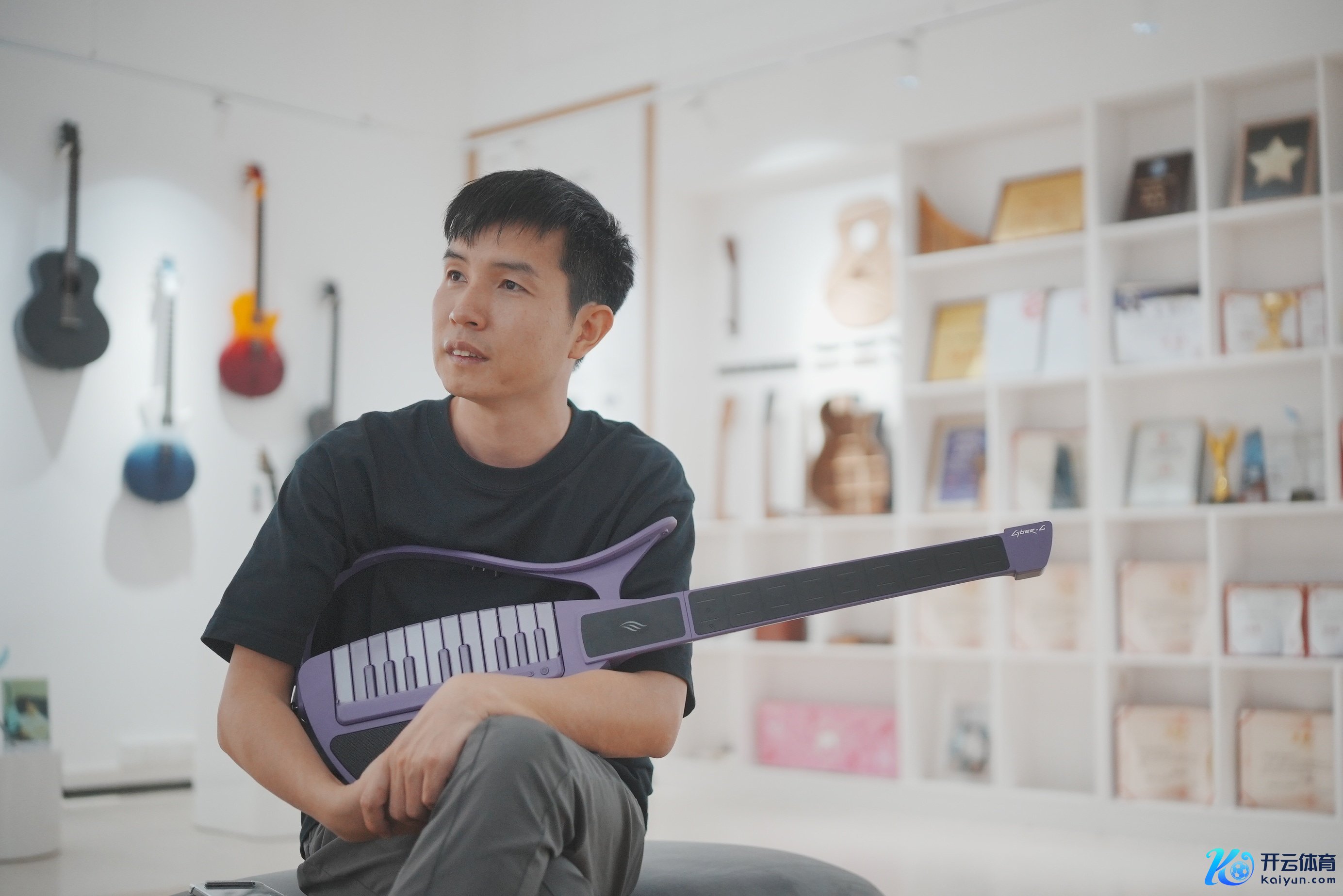 走进恩雅乐器的展厅,造型独有的赛博吉他(Cyber-G)引东说念主驻防。这是恩雅音乐本年5月新发布的智能吉他,它莫得传统木吉他的琴身,拔帜树帜的是一块碳纤维材质的薄板,琴弦则被替换为键盘模块,衔接上手机APP,就算是生分曲目,使用者也能清醒地弹奏。