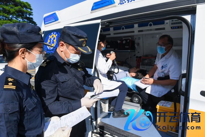 在深圳湾港口深圳一侧,海关使命主谈主员对参加第二次粤港跨境纵贯救护车演练的救护车进行出境前的查察(2024年10月31日摄)。新华社记者 毛想倩 摄