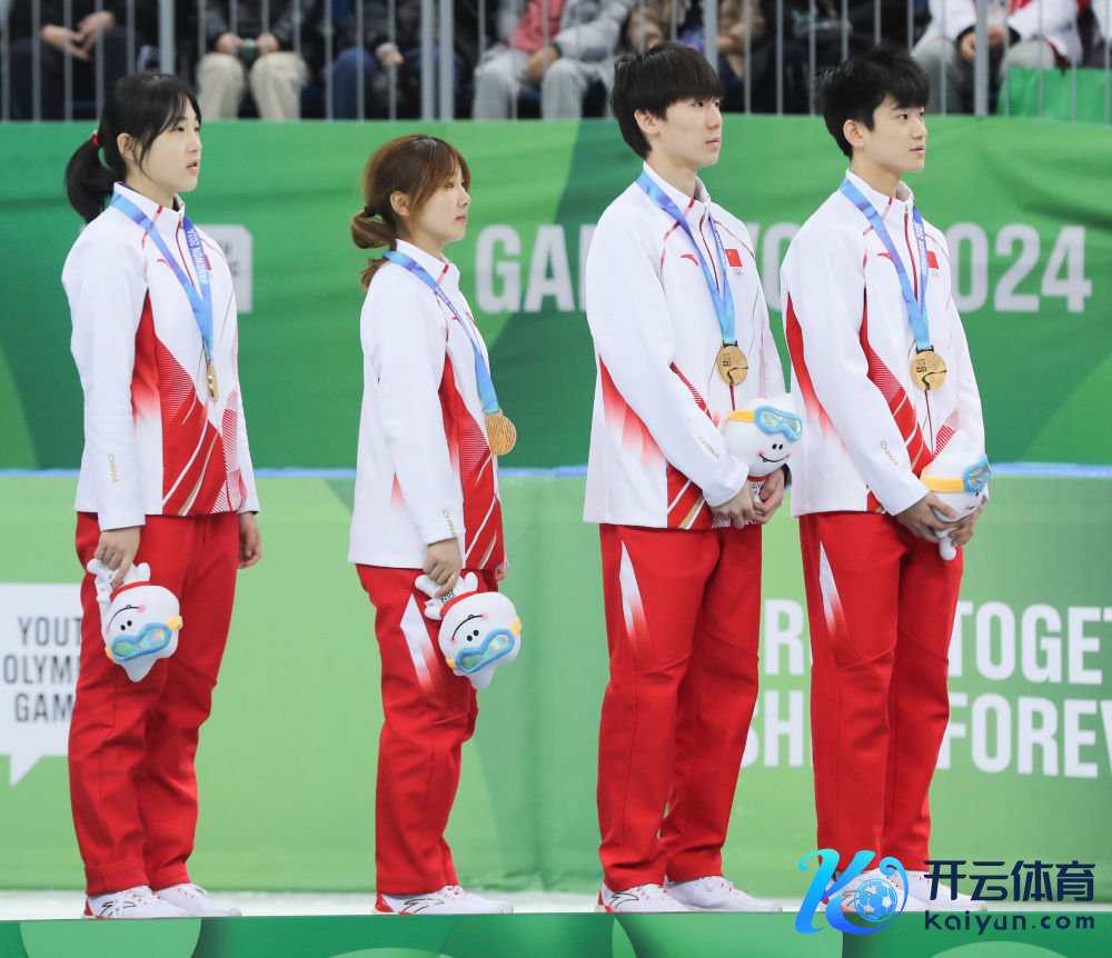 1月24日,中国队选手李金恣、杨婧茹、张柏浩和张心喆(从左至右)在2024年江原说念冬青奥会短说念速滑夹杂团体极力受奖典礼上。